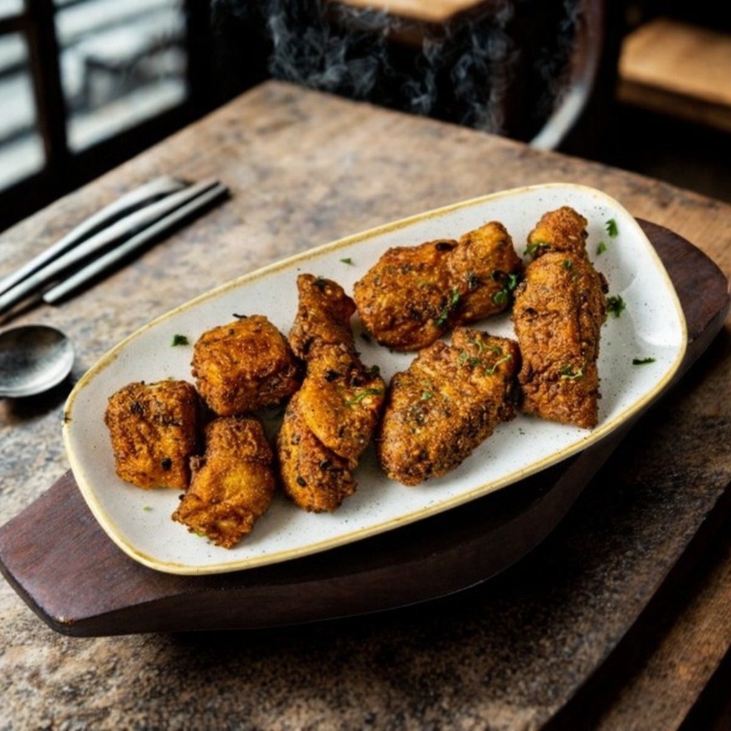 White, flaky fish—often boneless—that is marinated in a mixture of lemon juice, ginger-garlic paste, and strong spices like ajwain, cumin, coriander, and chili. The fish is then coated in a thick, crispy batter and deep-fried until it reaches a golden-brown, crunchy texture.